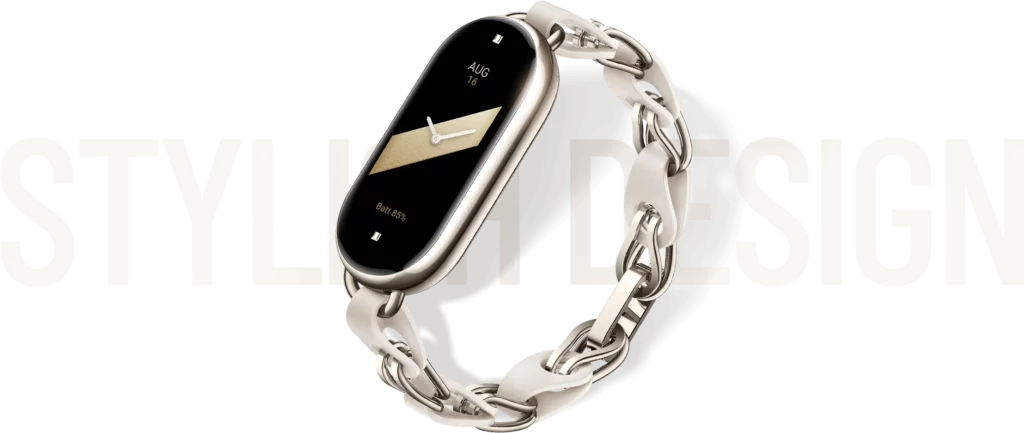 Xiaomi Smart Band 8 has been upgraded with Easy-detachable Straps that not only allow you to easily switch between different strap designs and materials, but also allows you to remove the strap entirely. The elegant body features a stylish metallic finish, now available in two new midframe colours: Champagne Gold and Graphite Black.