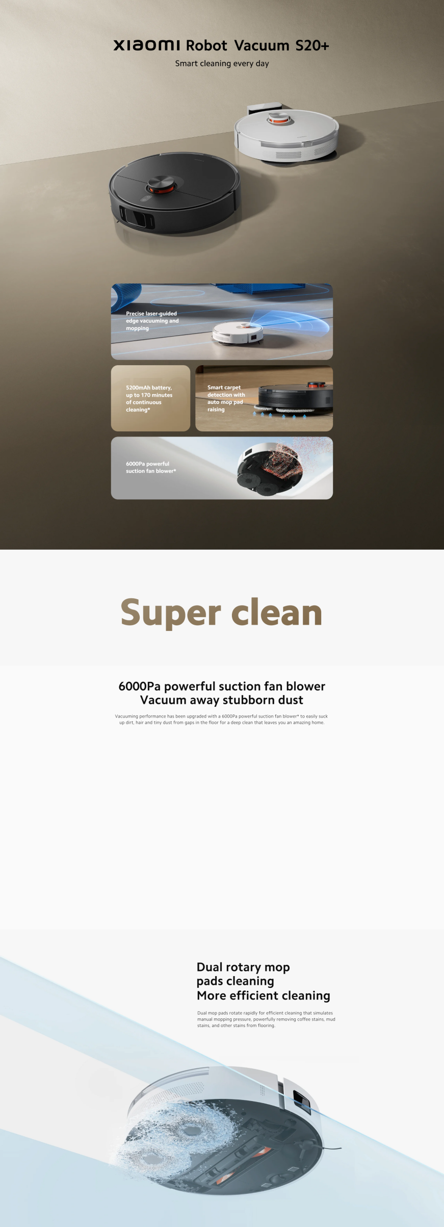 *The fan blower of Xiaomi Robot Vacuum S20+ generates up to 6000Pa air pressure. Data comes from Xiaomi Internal Labs. Suction power may vary in different test environments.