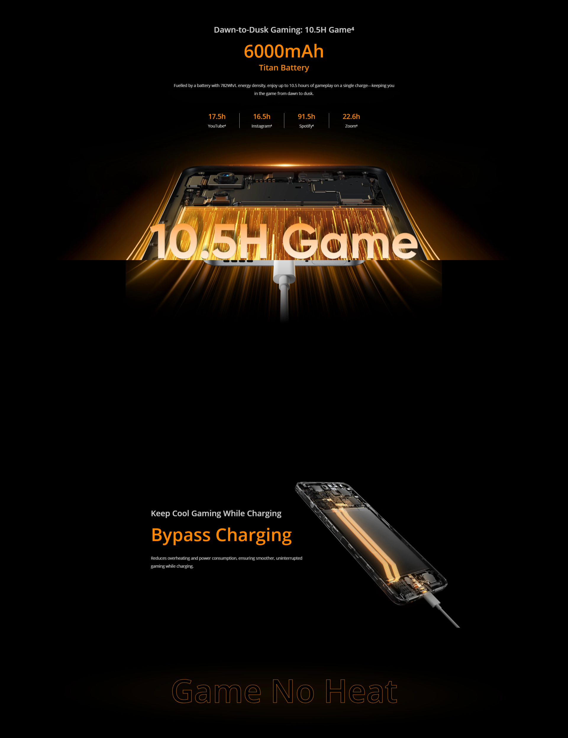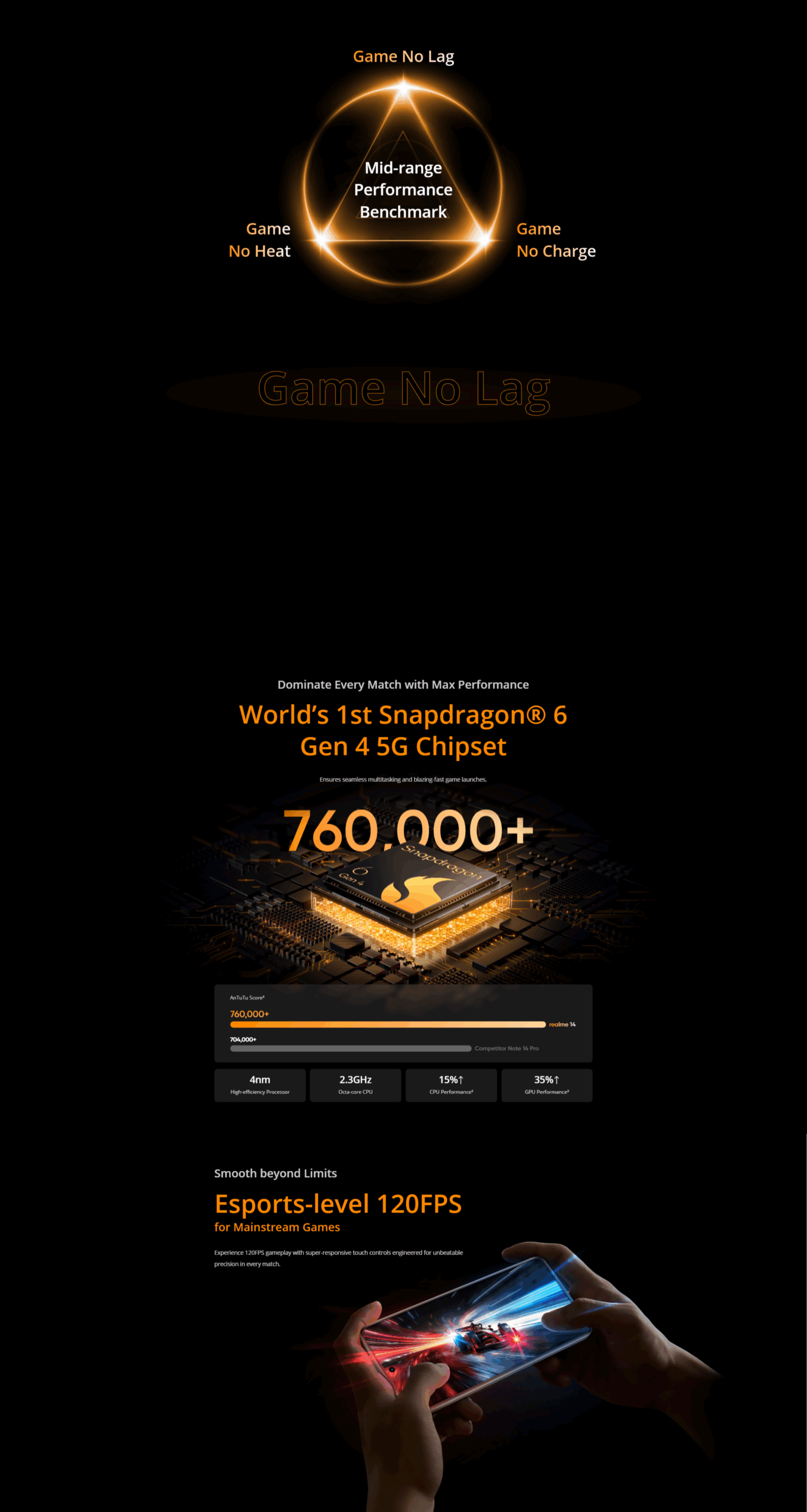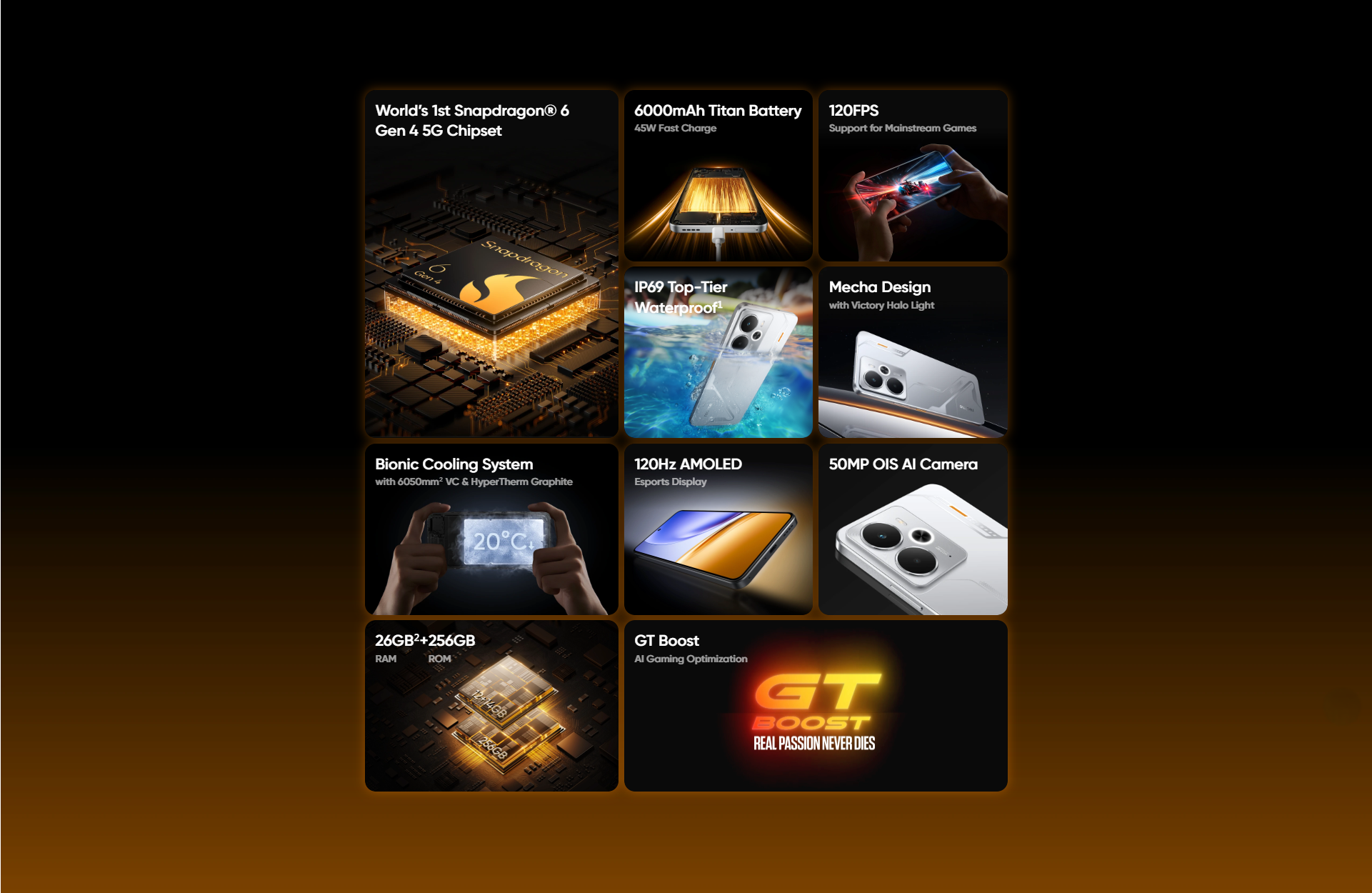 1. World’s 1st Snapdragon® 6 Gen 4 5G Chipset 2. 6000mAh Titan Battery&45W Charge 3. Mecha Design 4. Bionic Cooling System 5. 120Hz AMOLED Esports Display 6. 50MP OIS AI Camera