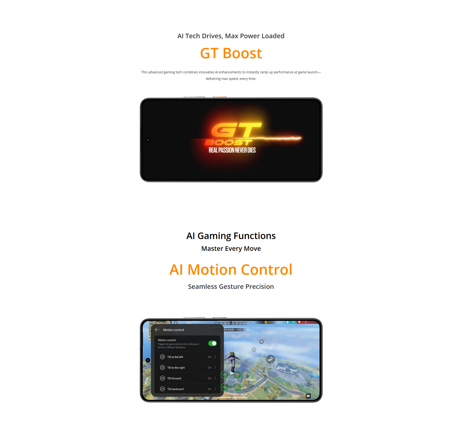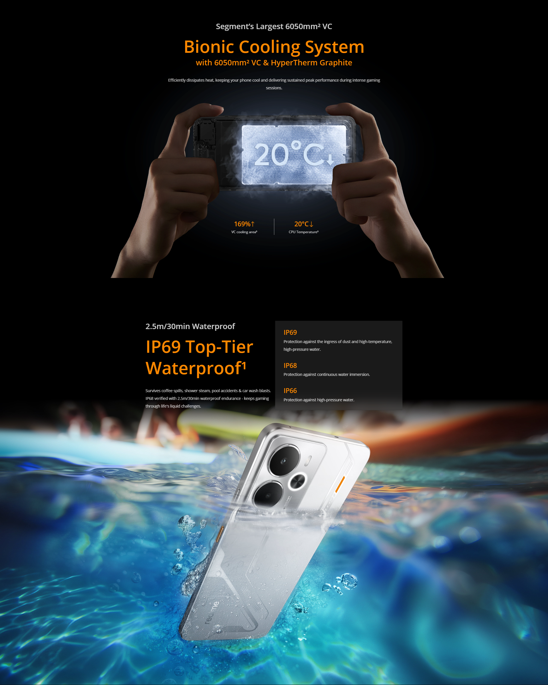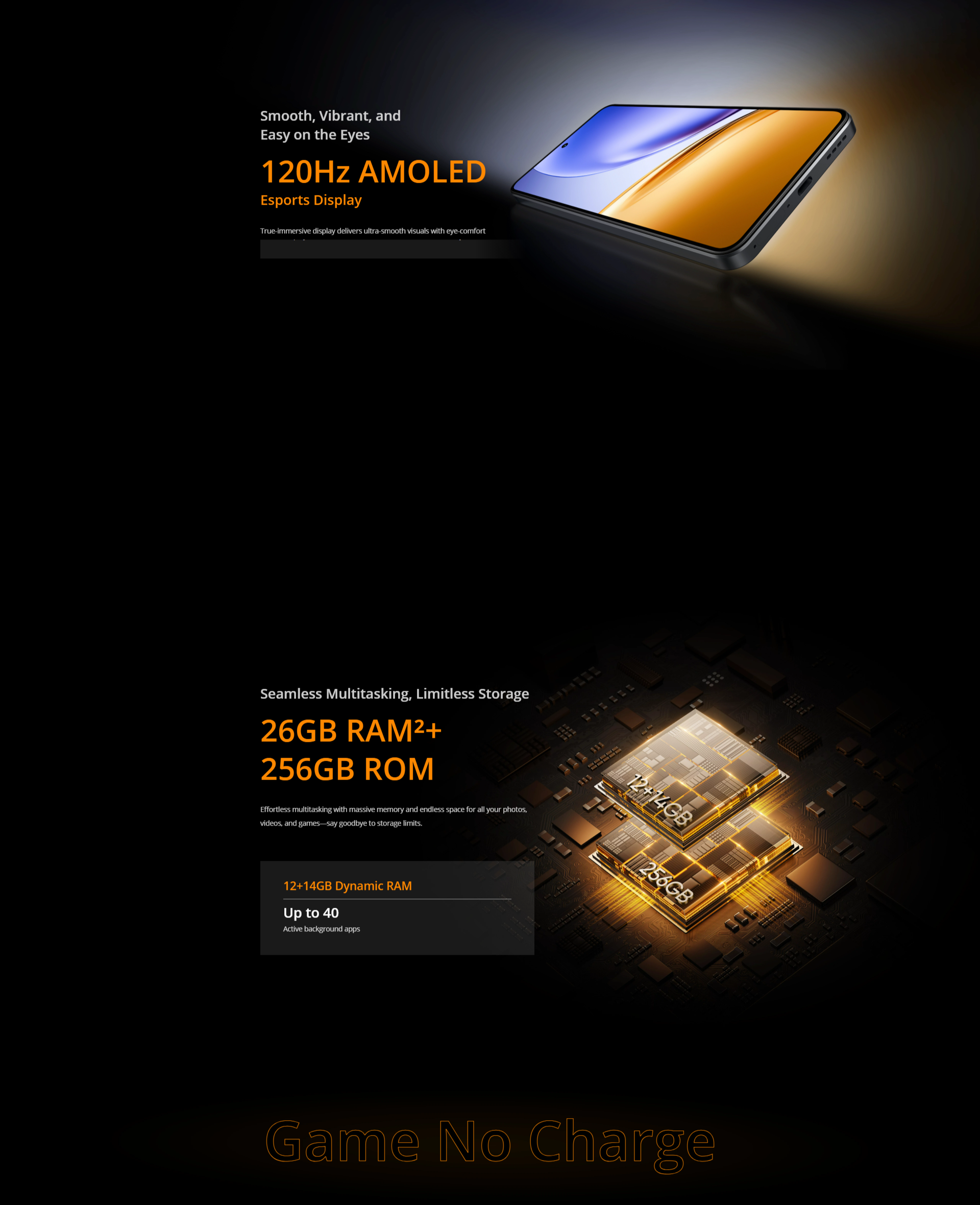1. World’s 1st Snapdragon® 6 Gen 4 5G Chipset 2. 6000mAh Titan Battery&45W Charge 3. Mecha Design 4. Bionic Cooling System 5. 120Hz AMOLED Esports Display 6. 50MP OIS AI Camera