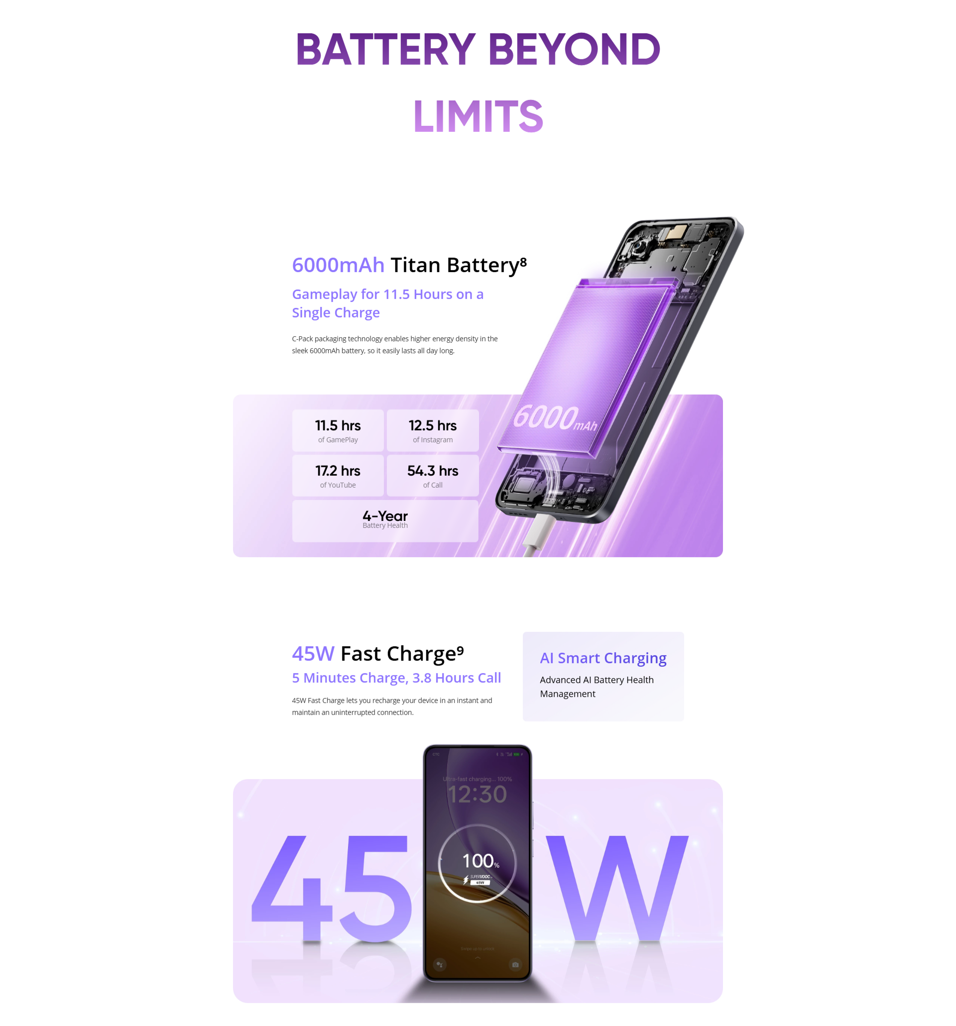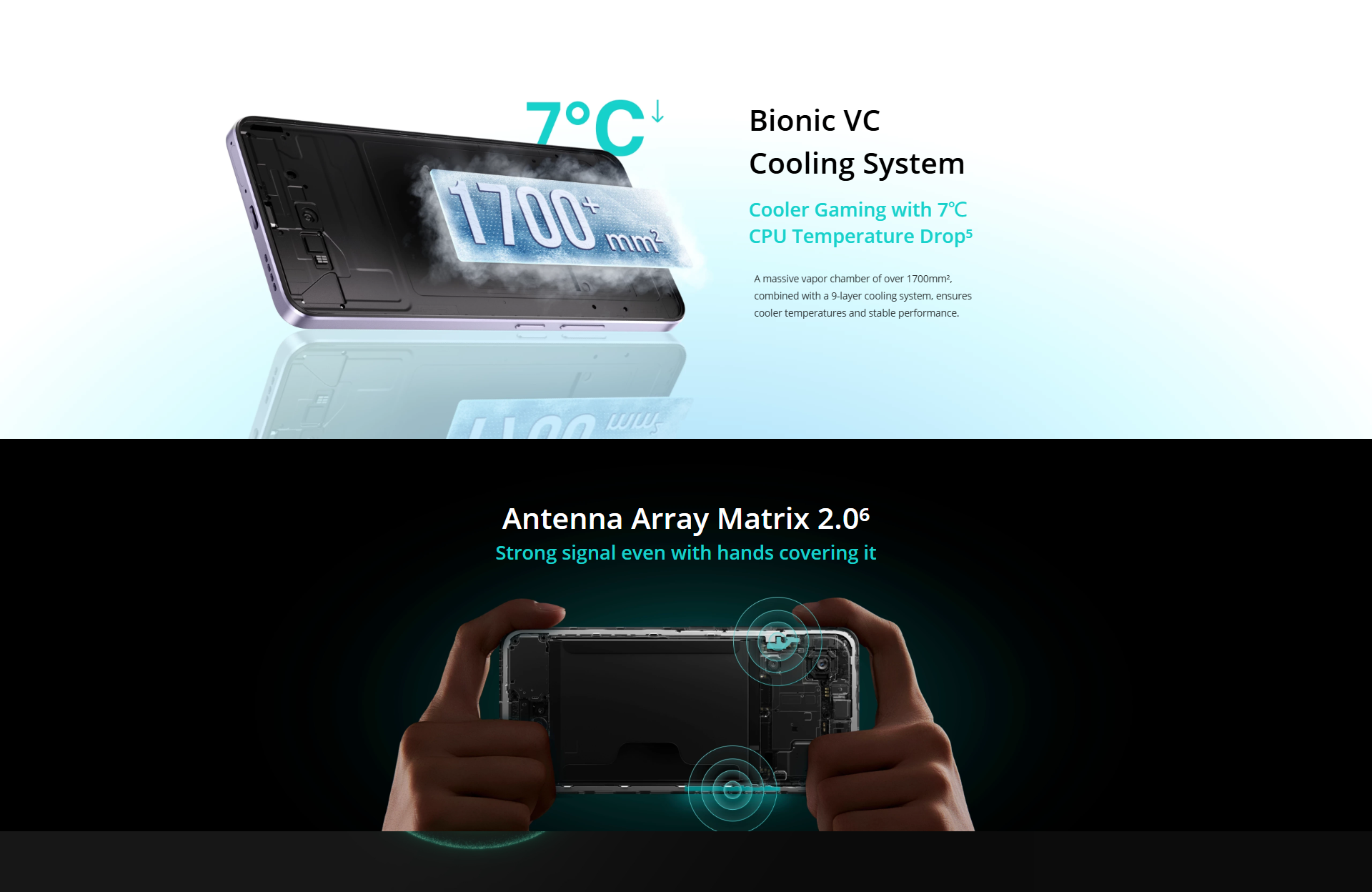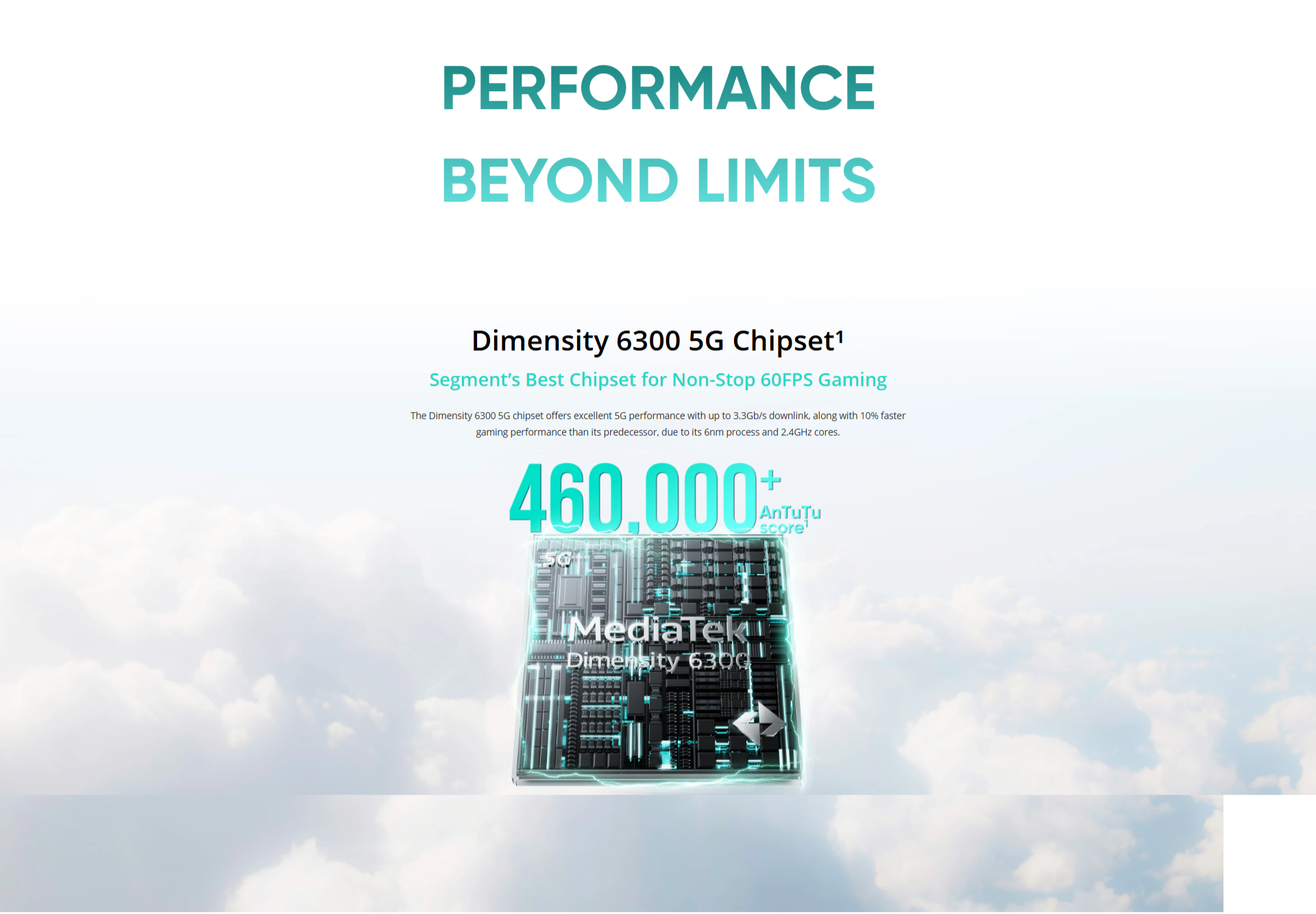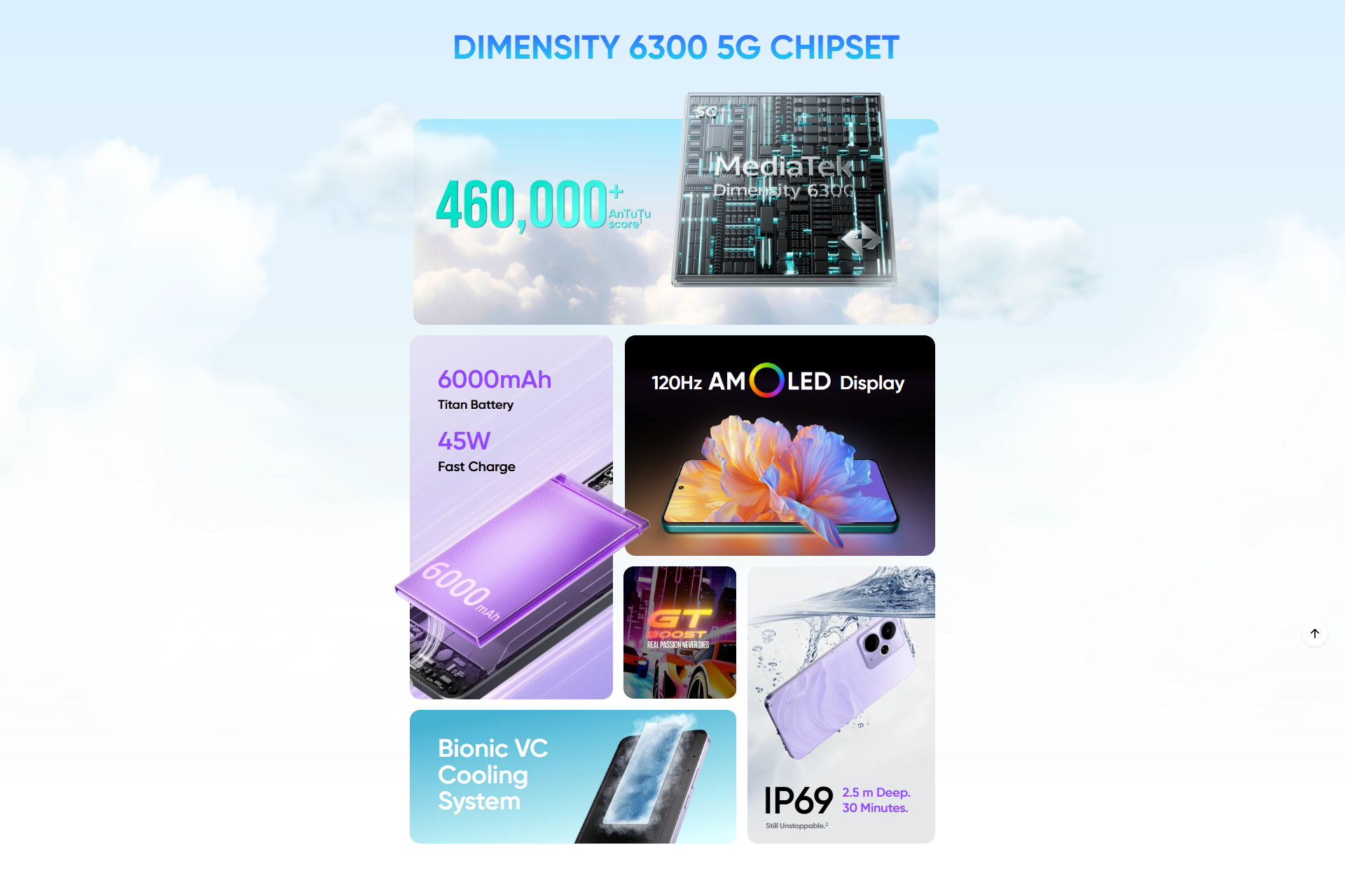 1. Dimensity 6300 5G Chipset 2. 6000mAh Titan Battery&45W Fast Charge 3. IP69 Top-tier Waterproof 4. 120Hz AMOLED Esports Display 5. Bionic VC Cooling System 6. GT BOOST:AI Tech Drives, Max Power Loaded