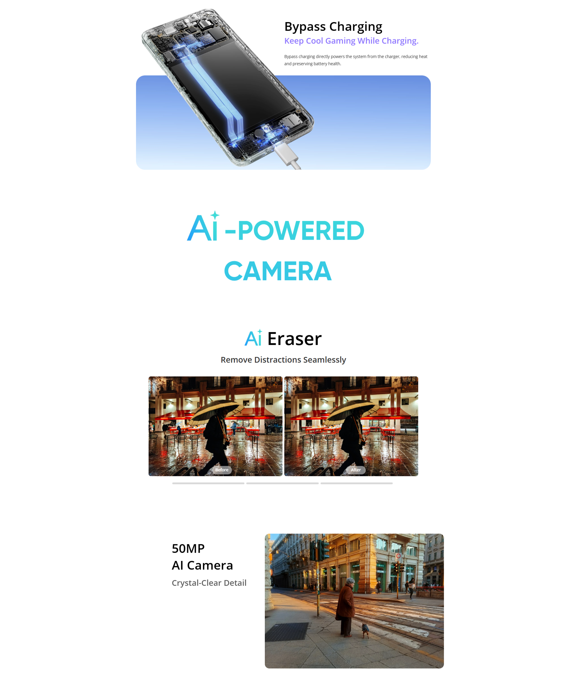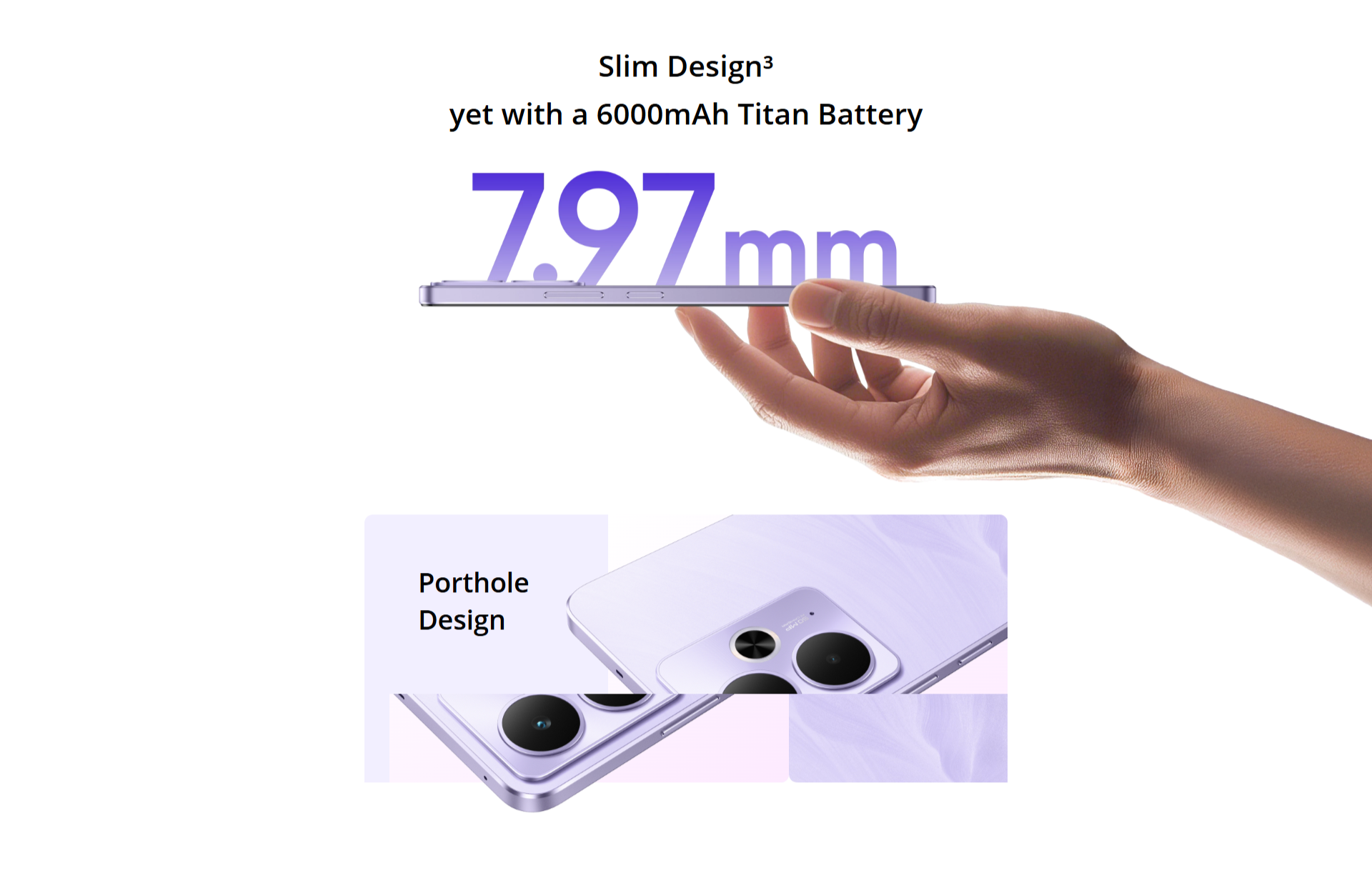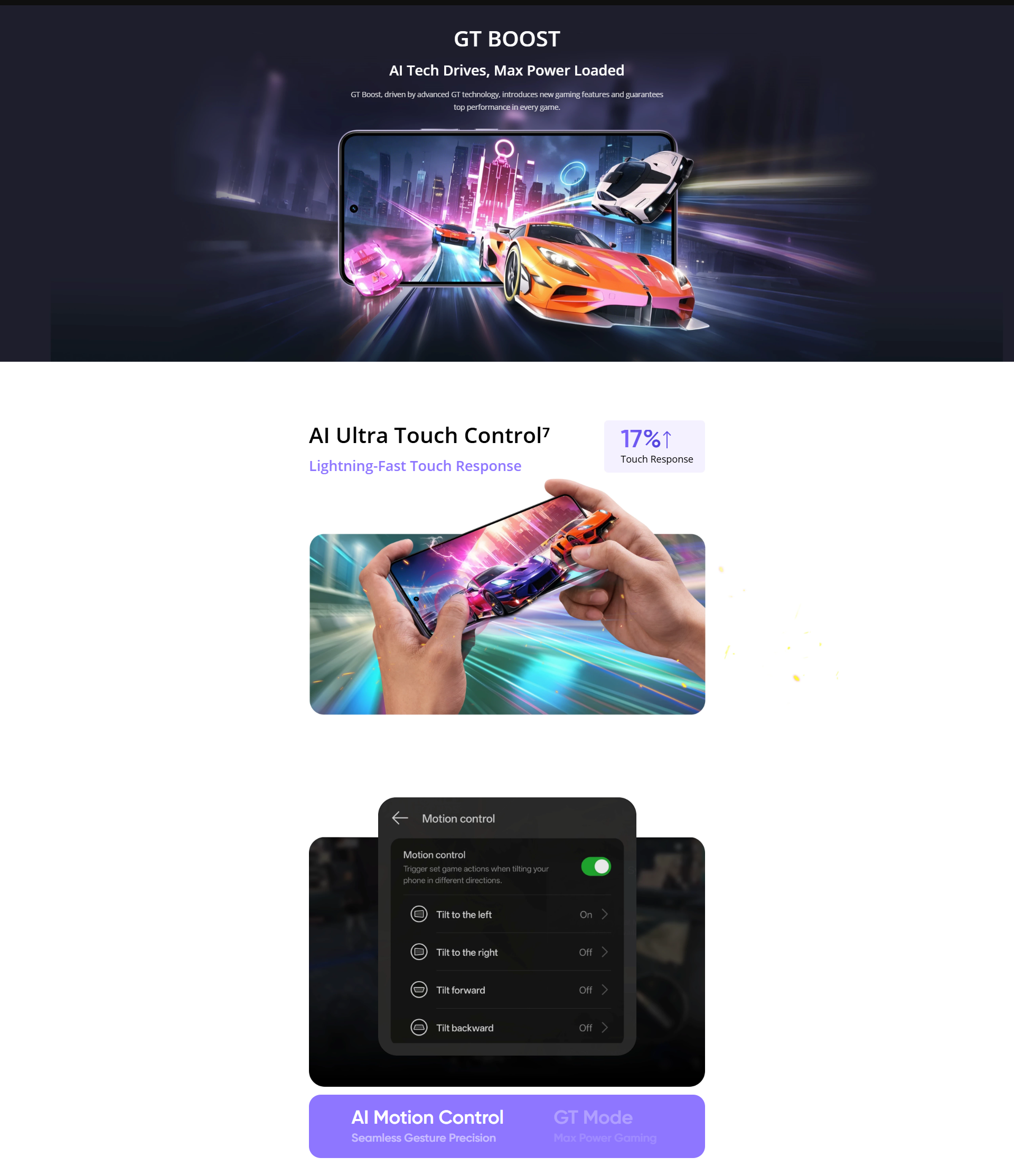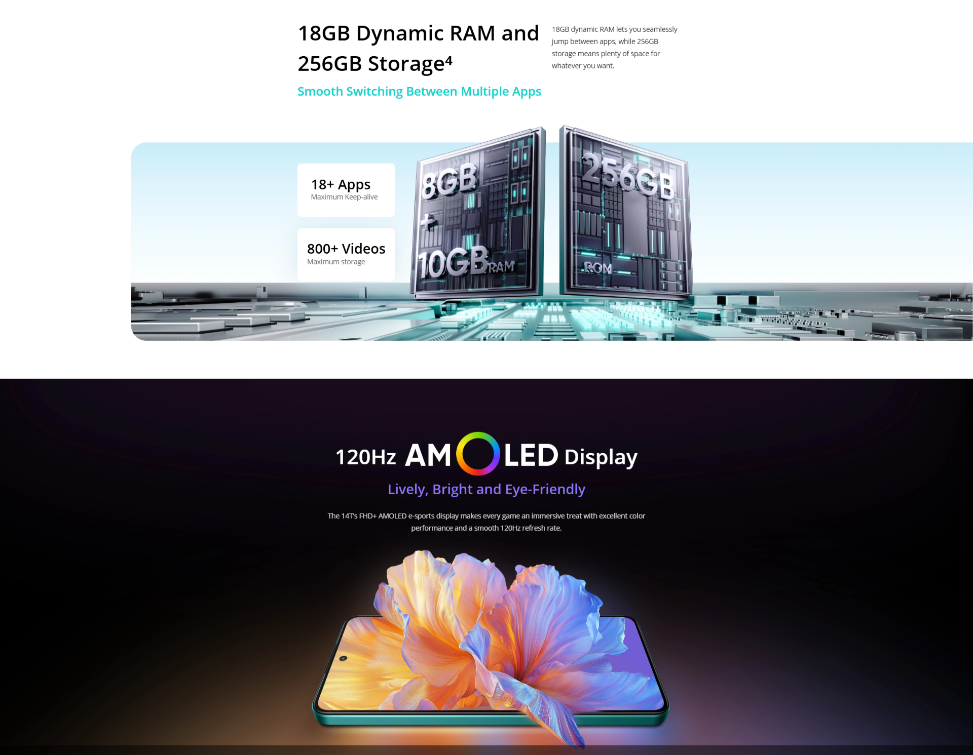 1. Dimensity 6300 5G Chipset 2. 6000mAh Titan Battery&45W Fast Charge 3. IP69 Top-tier Waterproof 4. 120Hz AMOLED Esports Display 5. Bionic VC Cooling System 6. GT BOOST:AI Tech Drives, Max Power Loaded
