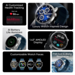 - Advanced Stainless Steel Textured Body, 1.43” (3.63cm) AMOLED Display, IP68 Dust & Water Resistance