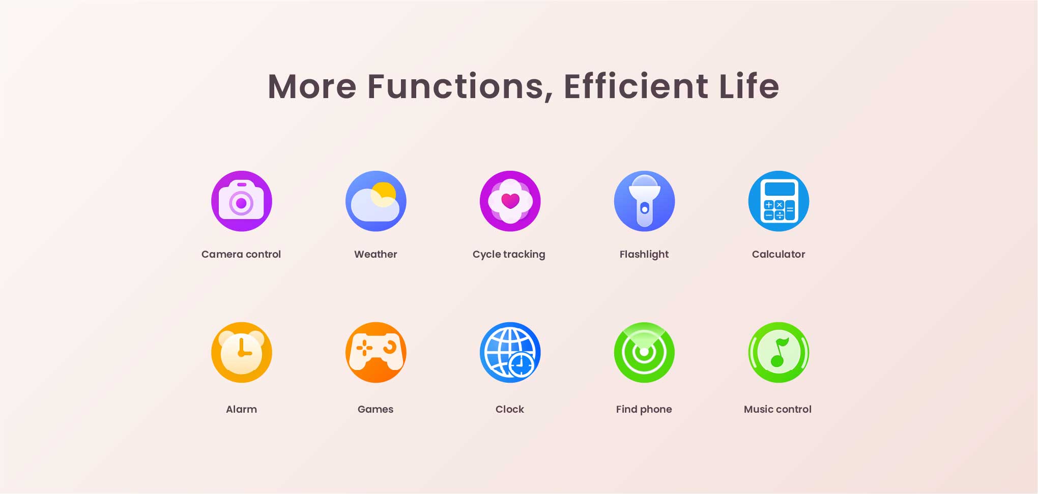 breathing exercises, pressure monitoring, sleepping record, altitude, compass, timer, alarm, stop watch, calculator, calendar, weather, women’s health, find your phone, music control, App messages reminder, incoming call reminder, health reminder…