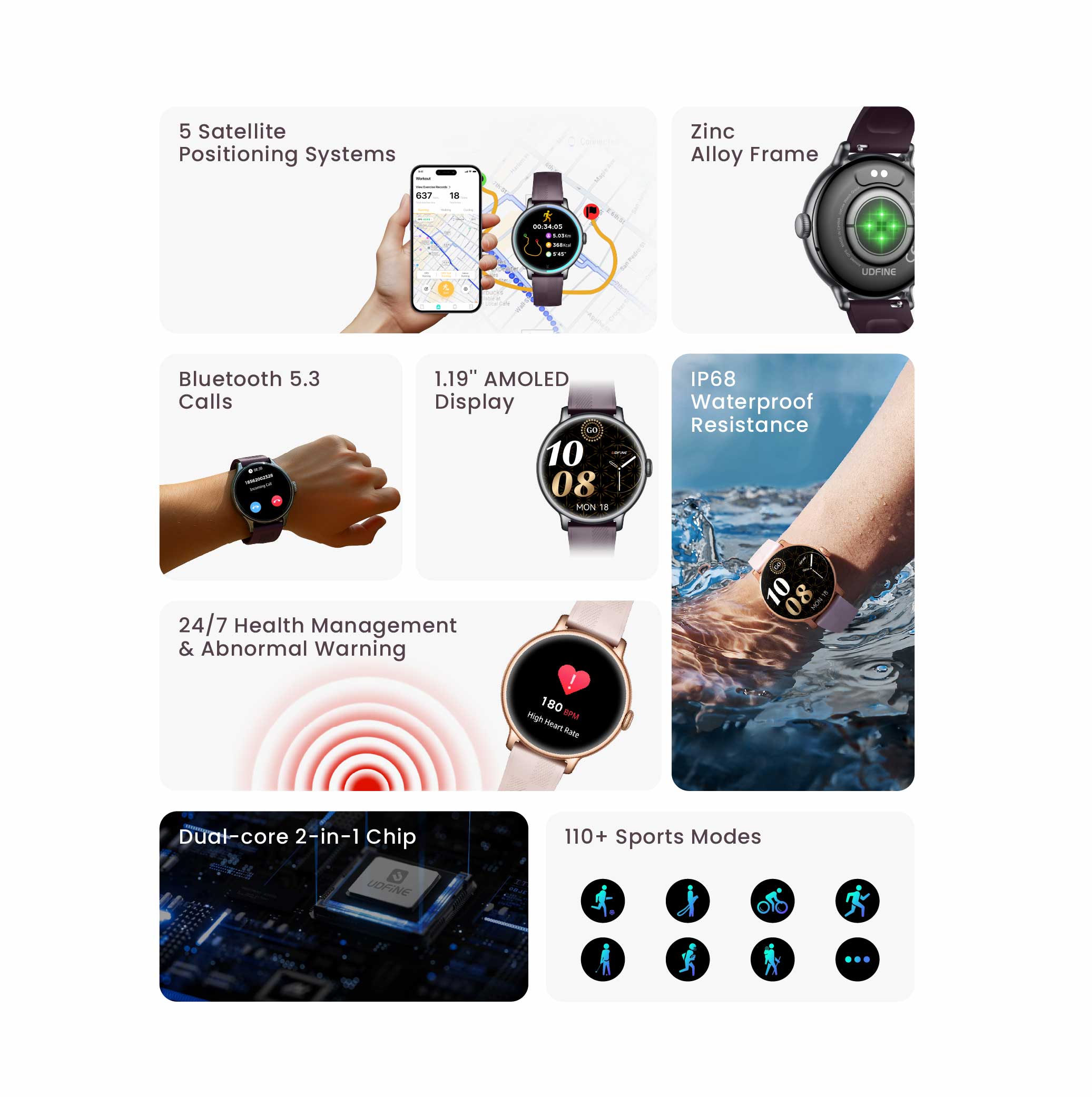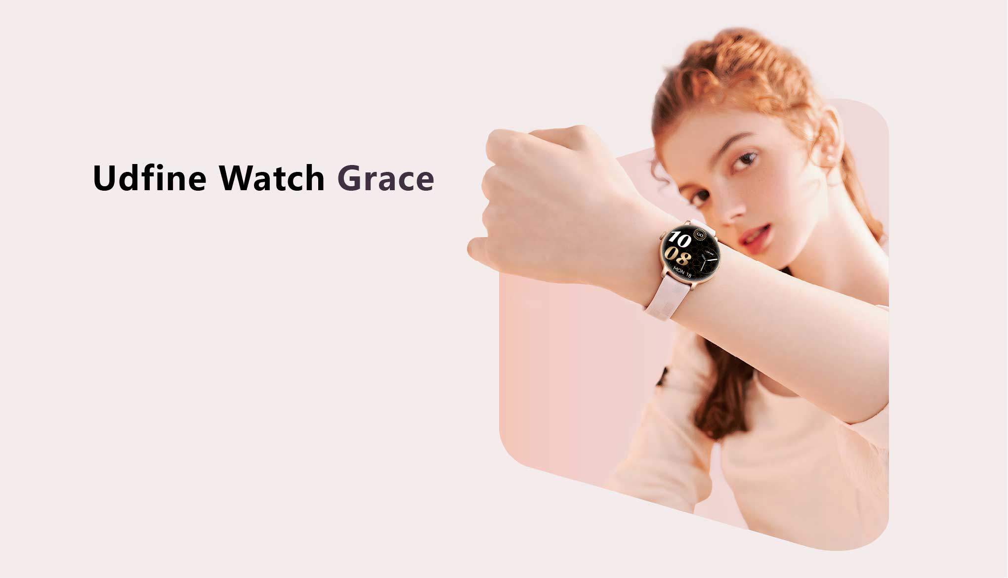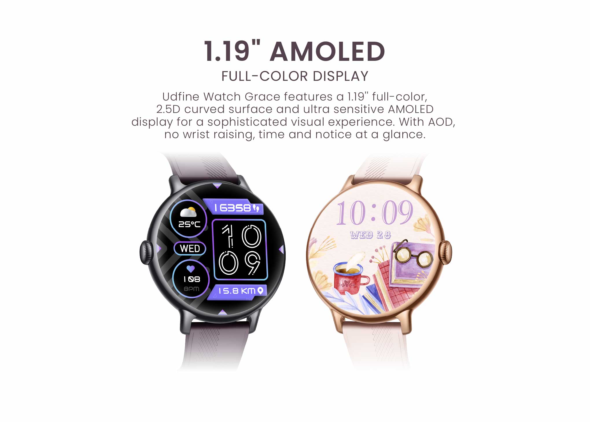 Udfine Watch Grace features a 1.19” full-color,2.5D curved surface and ultra sensitive AMOLED display for a sophisticated visual experience. With AOD,no wrist raising, time and notice at a glance.