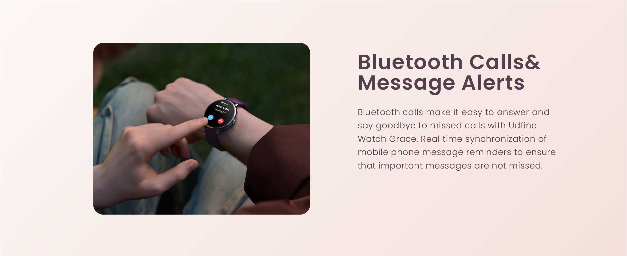 Bluetooth calls make it easy to answer and say goodbye to missed calls with Udfine Watch Grace. Real time synchronization of mobile phone message reminders to ensure that important messages are not missed.