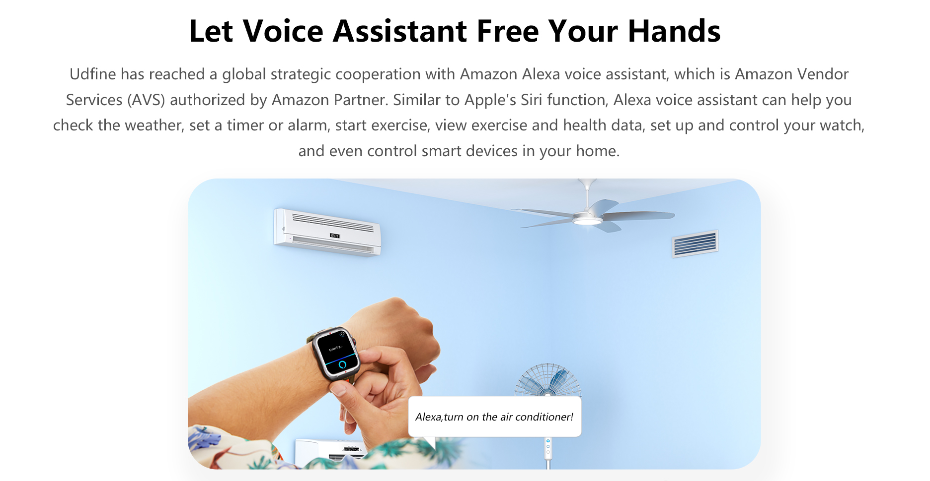 Udfine has reached a global strategic cooperation with Amazon Alexa voice assistant, which is Amazon Vendor Services (AVS) authorized by Amazon Partner. Similar to Apple’s Siri function, Alexa voice assistant can help you check the weather, set a timer or alarm, start exercise, view exercise and health data, set up and control your watch, and even control smart devices in your home.