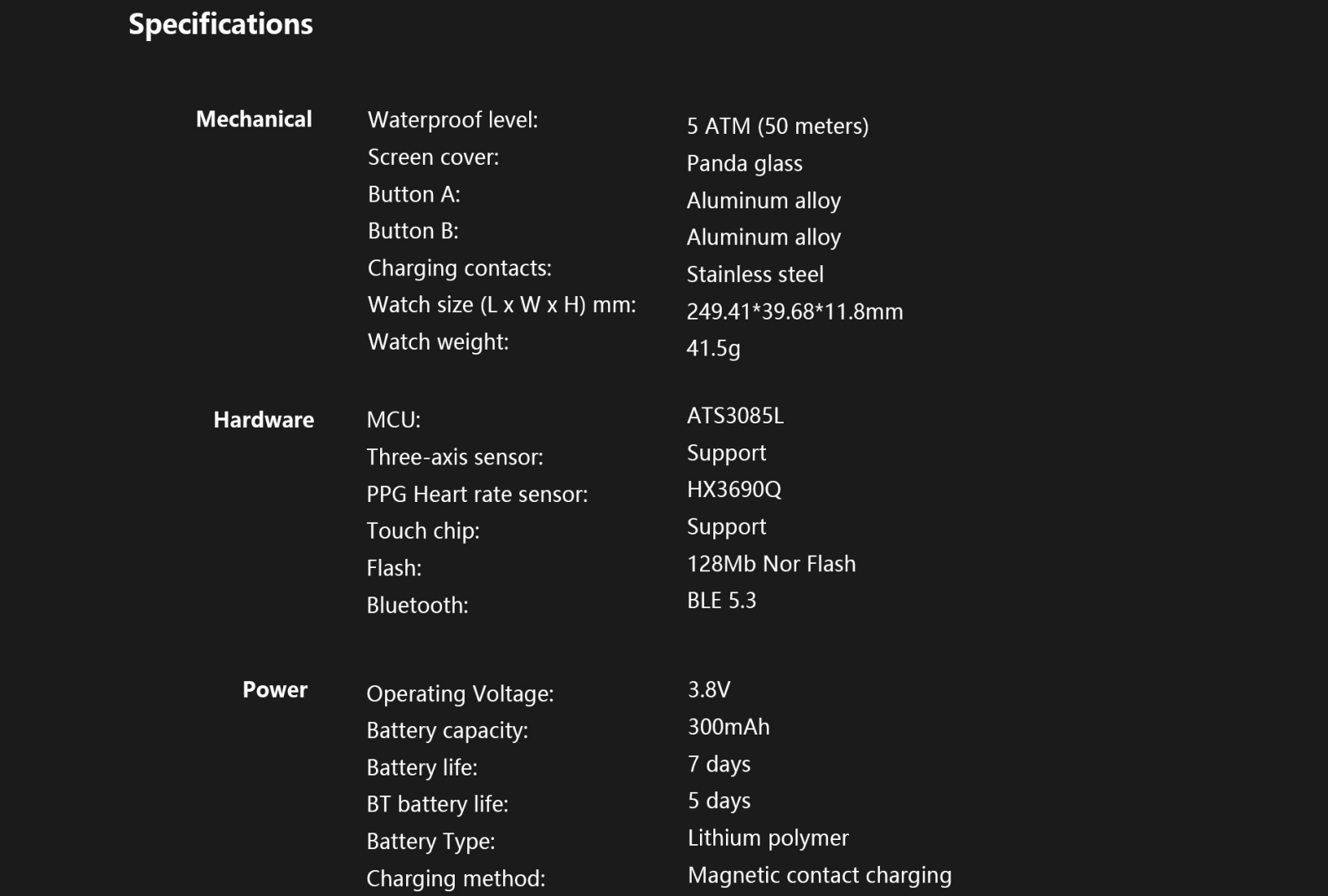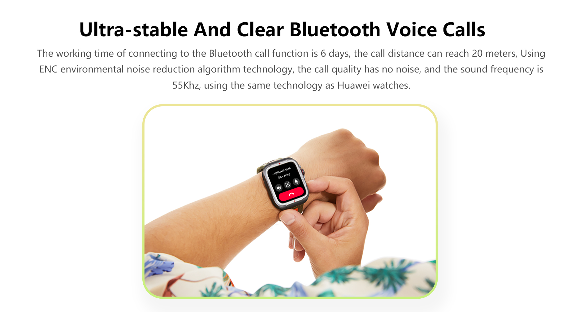 The working time of connecting to the Bluetooth call function is 6 days, the call distance can reach 20 meters, using ENC environmental noise reduction algorithm technology, the call quality has no noise, and the sound frequency is 55Khz, using the same technology as Huawei watches.