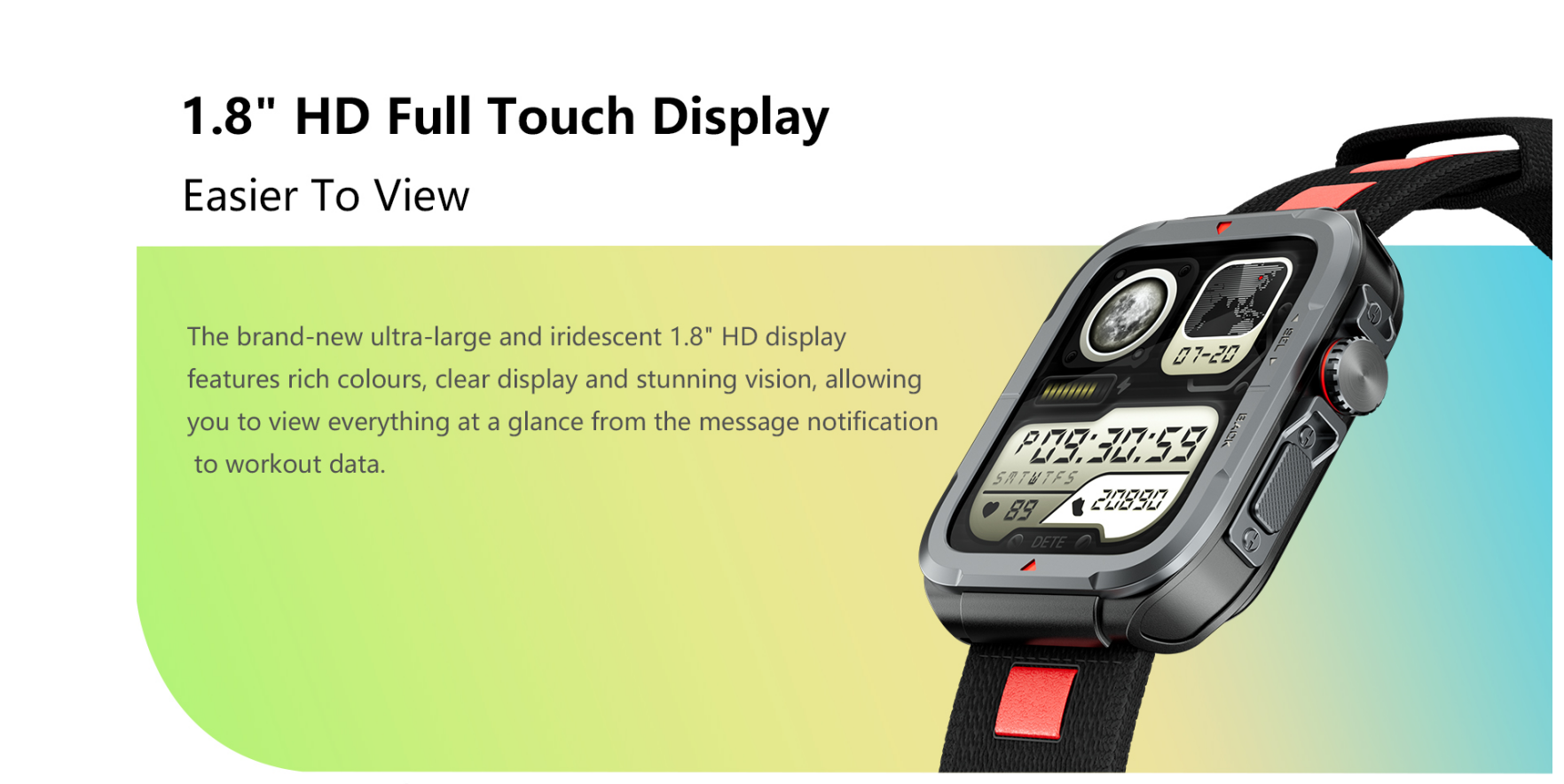 The brand-new ultra-large and iridescent 1.8″ HD display features rich colours, clear display and stunning vision, allowing you to view everything at a glance from the message notification to workout data.