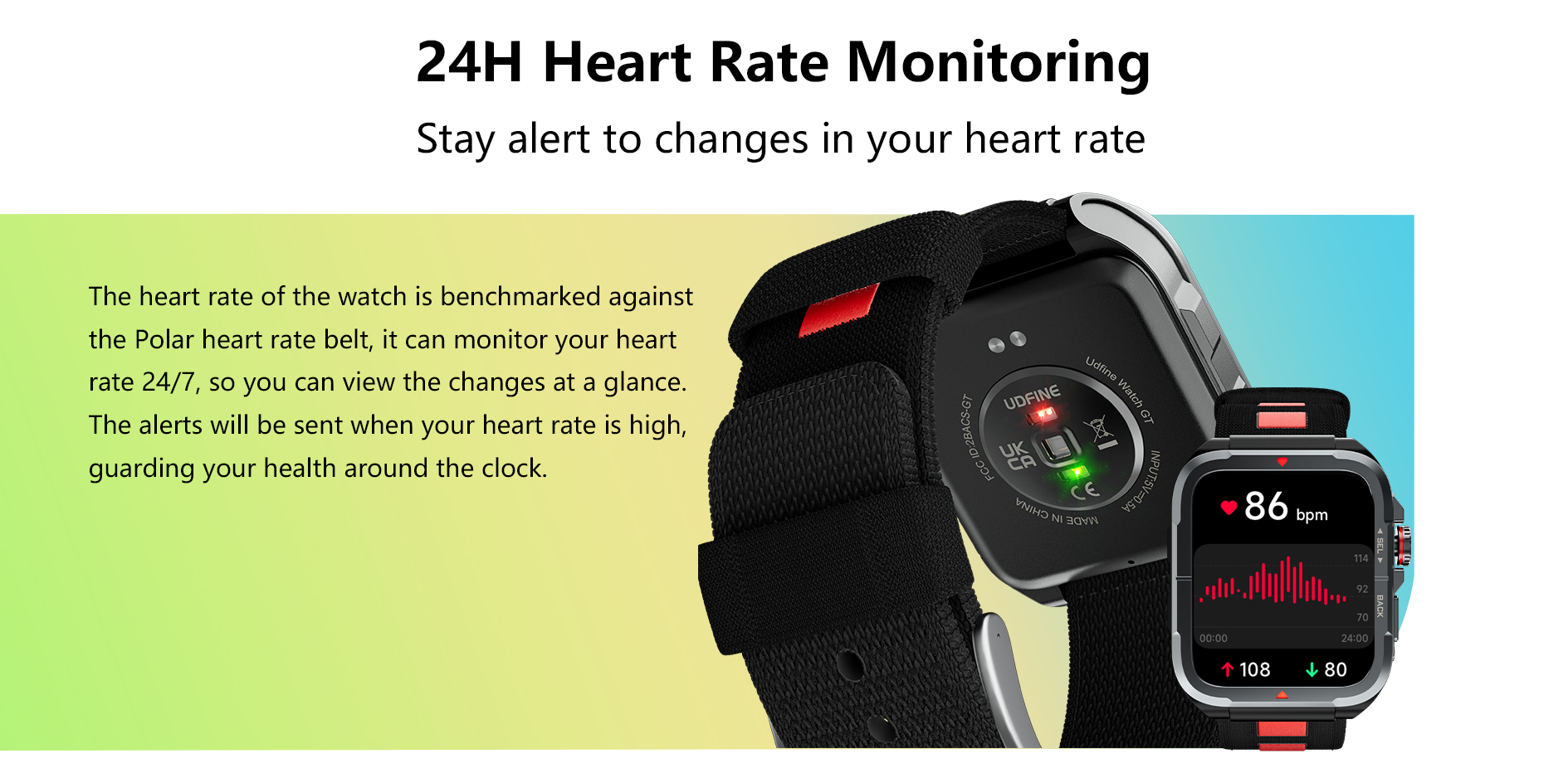 The heart rate of the watch is benchmarked against the Polar heart rate belt, it can monitor your heart rate 24/7, so you can view the changes at a glance. The alerts will be sent when your heart rate is high, guarding your health around the clock.