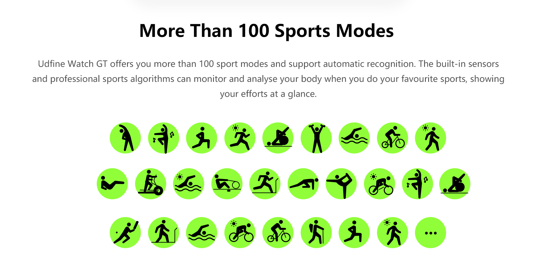 Udfine Watch GT offers you more than 100 sport modes and support automatic recognition. The built-in sensors and professional sports algorithms can monitor and analyse your body when you do your favourite sports, showing your efforts at a glance.