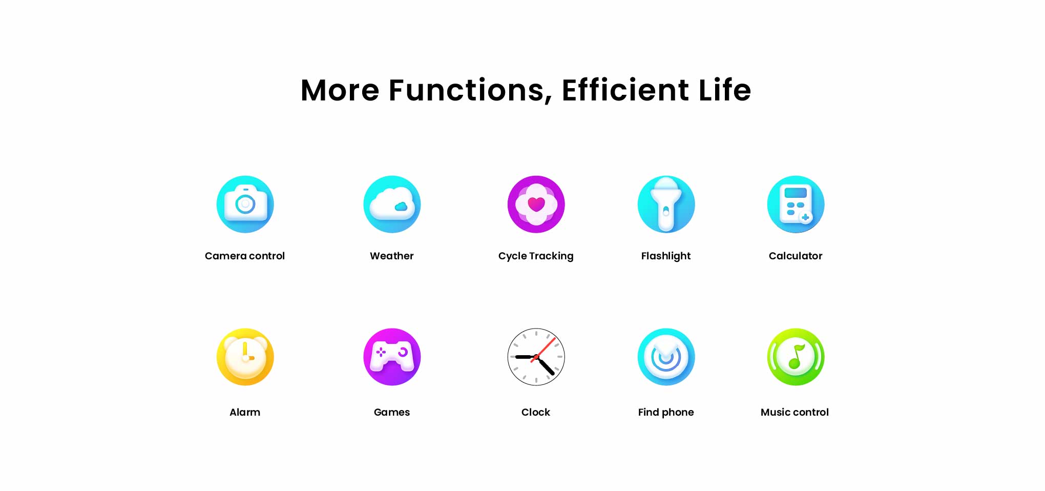 breathing exercises, pressure monitoring, sleepping record, alarm, stop watch, calculator, calendar, weather, women’s health, find your phone, music control, App messages reminder, incoming call reminder, health reminder…