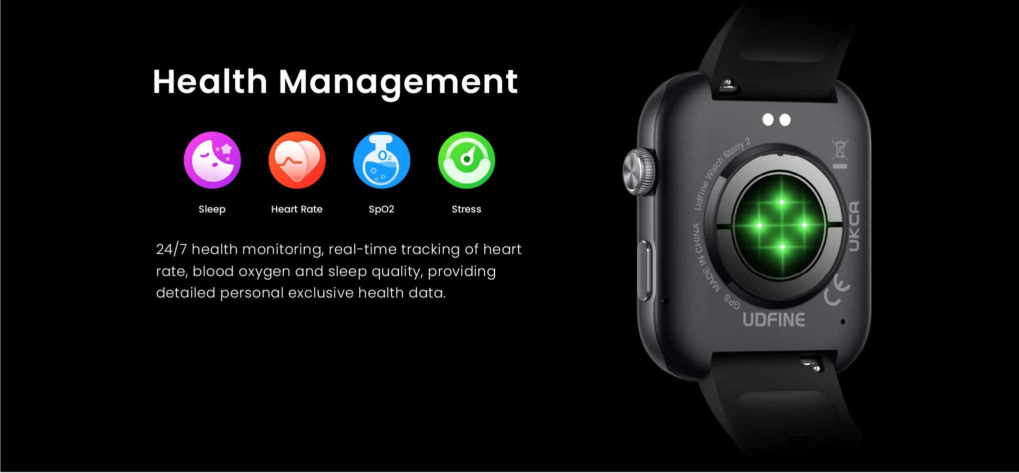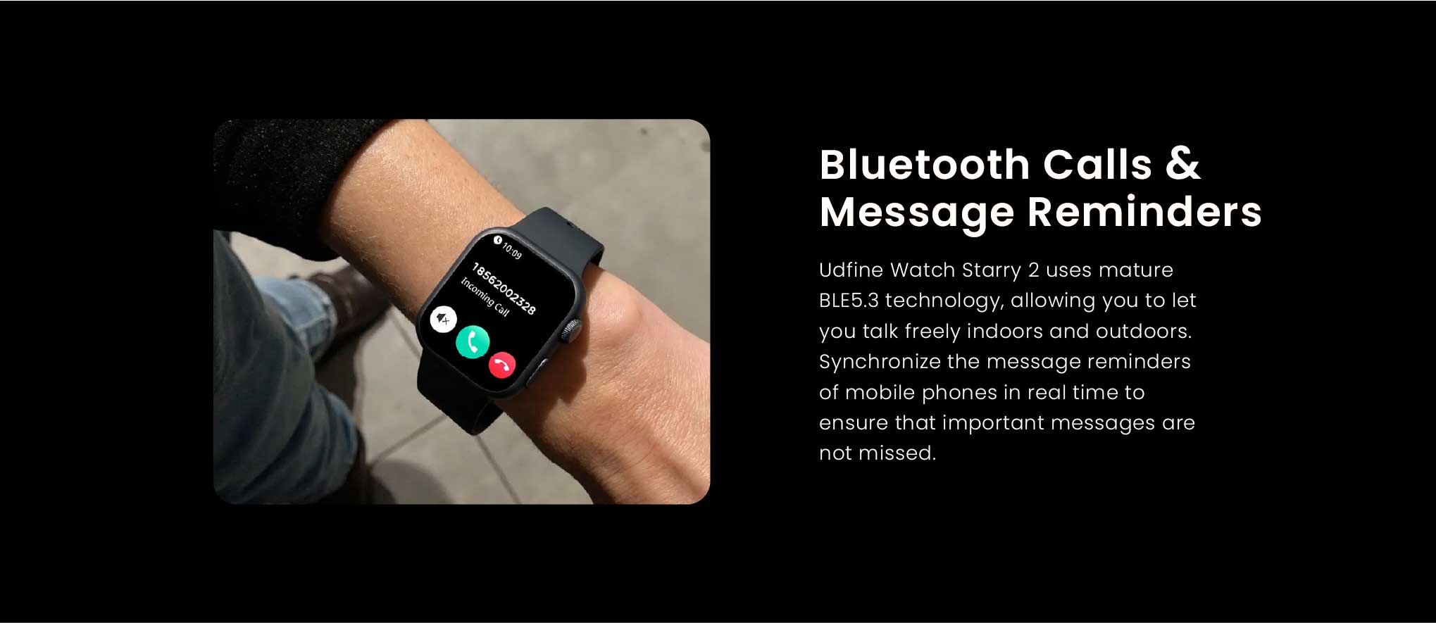 Udfine Watch Starry 2 uses mature BLE5.3 technology, allowing you to let you talk freely indoors and outdoors. Synchronize the message reminders of mobile phones in real time to ensure that important messages are not missed.