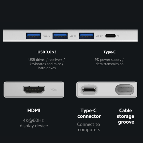 *Regarding USB 3.0: Performance of the Xiaomi 5-in-1 Type-C hub complies with USB-IF standards: USB 3.0 = USB 3.1 Gen 1 = USB 3.2 Gen 1 x1. With a theoretical rate of 5Gbps, USB 3.0 achieves a transmission speed of up to 450MB/s. Please ensure your devices and connecting cables support USB 3.0 and above standards.